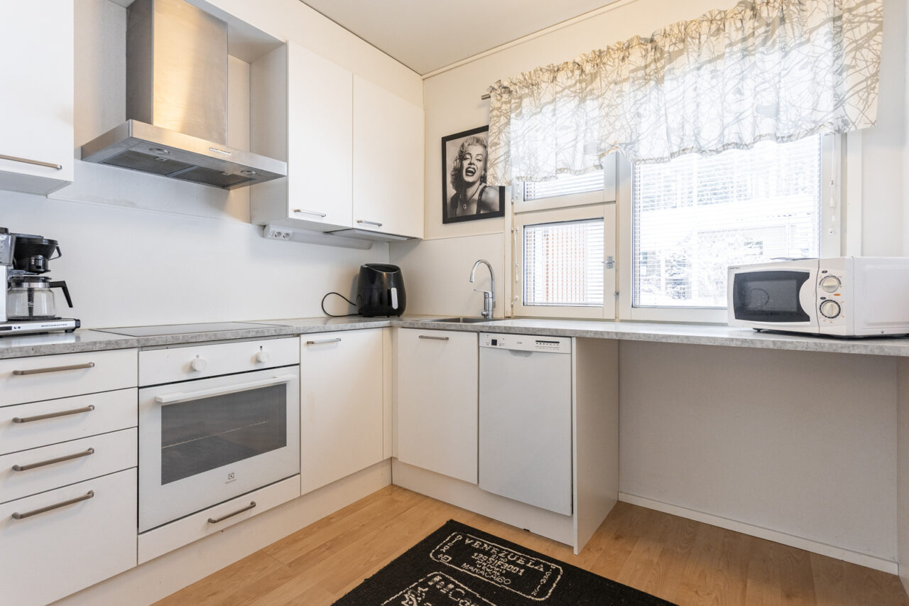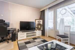 Asunnon sydämenä toimii v.2020 uusittu tilava keittiö, jossa on hyvin säilytys- ja työskentelytilaa. Myös ruokailuryhmä mahtuu hyvin keittiöön. Olohuone on helppo sisustaa monipuolisesti; tilaan mahtuu luontevasti myös sänky. Olohuoneesta on käynti katetulle terassille, joka tuo mukavasti lisätilaa ja mahdollistaa viihtyisät oleskeluhetket aikaisesta keväästä pitkälle syksyyn.
