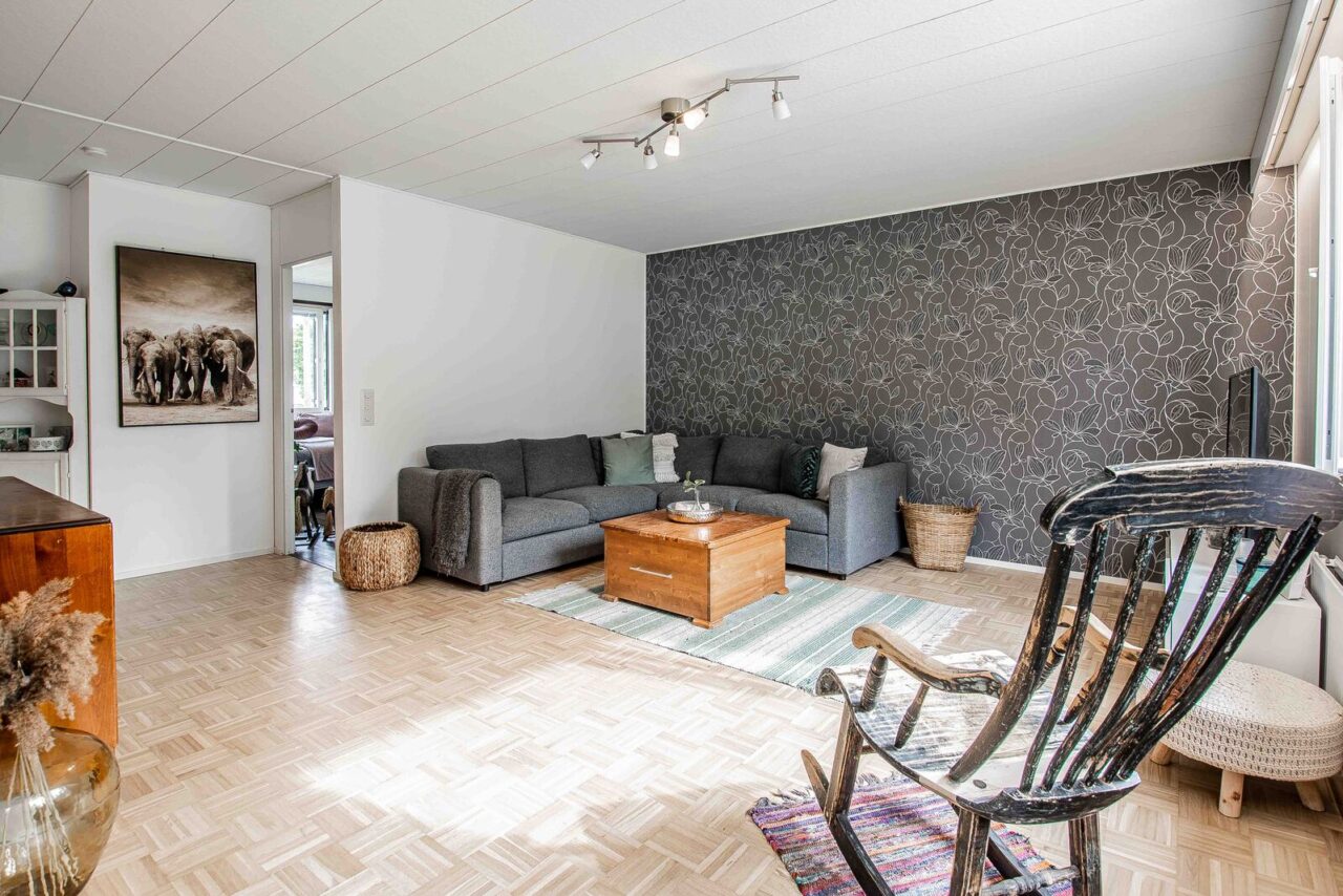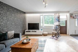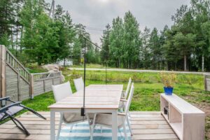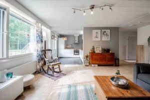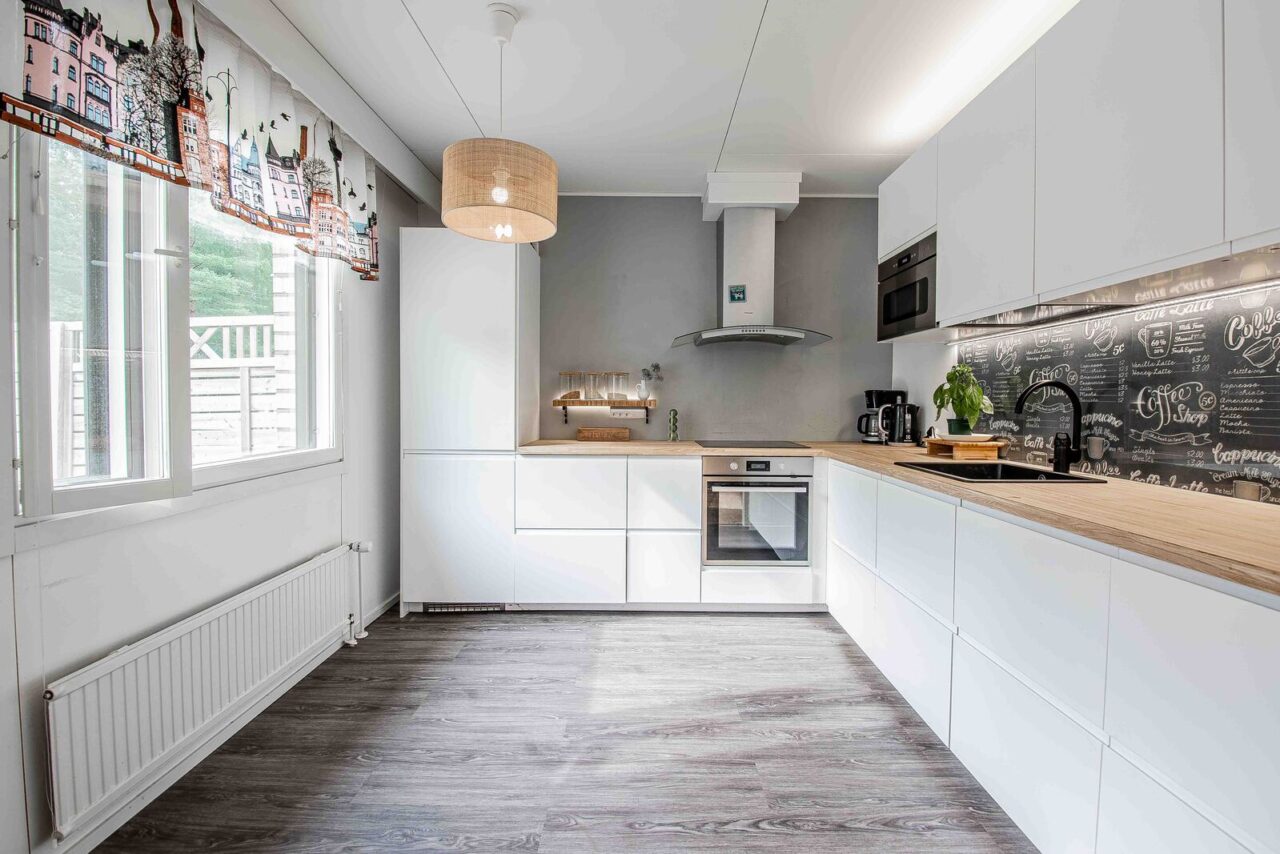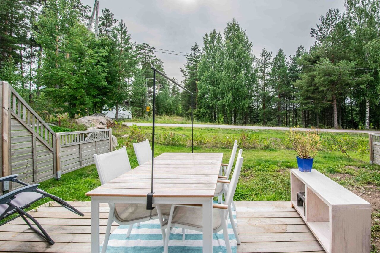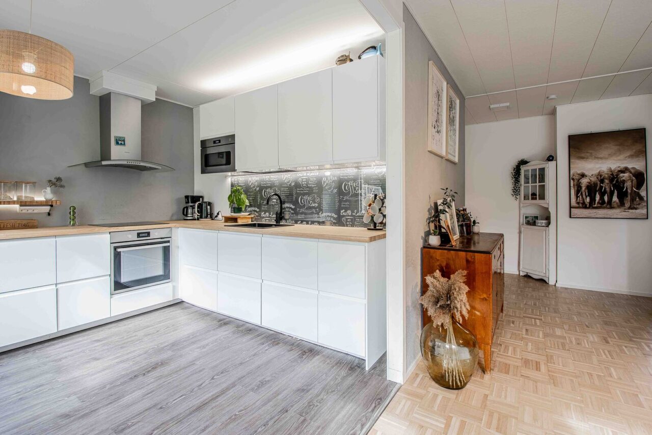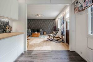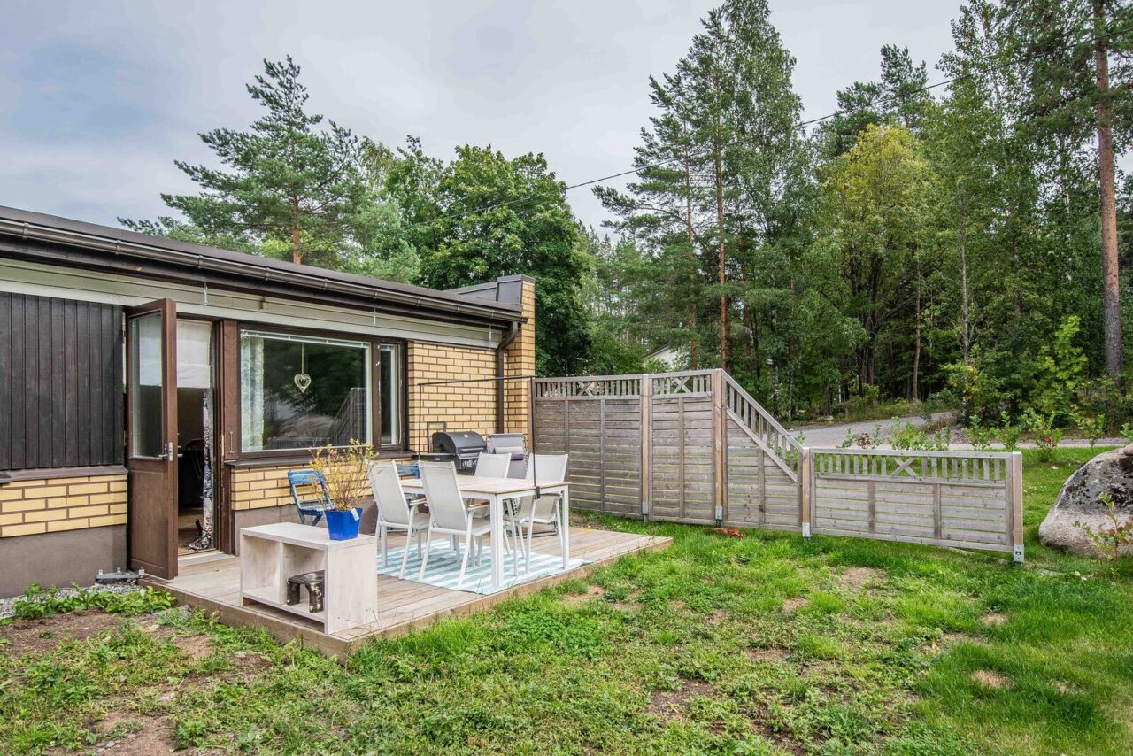 Tässä kauttaaltaan remontoidussa päätykolmiossa on avoin pohjaratkaisu. Näkymä valkeaan keittiöön avautuu olohuoneesta. Keittiön integroidut laitteet tekevät siitä tyylikkään ja viimeistellyn. Olohuoneesta on kulku tilavalle terassille, josta näkymä kävelyreitille ja ryhdikkääseen metsikköön. Koiran ulkoilutus on näissä puitteissa helppoa!