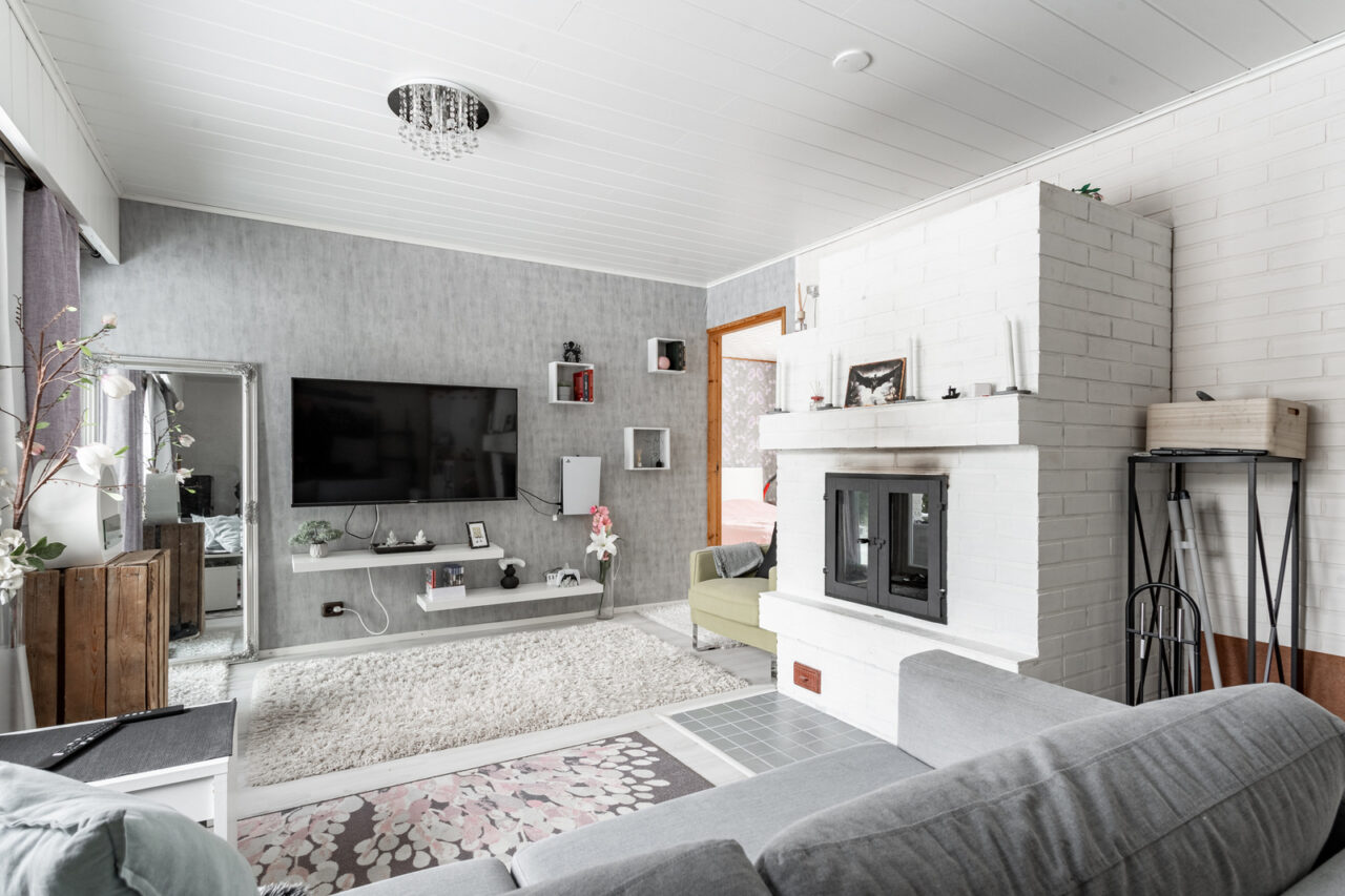 Tässä talossa on neliöt käytetty tehokkaasti: makuuhuoneet ja olohuone ovat reilun kokoiset, erillinen keittiö runsain kaapistoin ja näyttävä takka olohuoneen komistuksena. Pihaa on riittävästi peleihin ja leikkeihin ja tontti on oma, tottakai. Puukiuas saunassa ja autotalli löytyy myös joko auton säilytykseen tai työ- ja säilytystilaksi.
